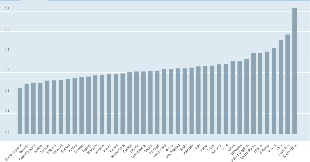 The above data from oecd.org shows inequality by country using the “Gini Coefficient”, which is a measure of cumulative inequality given as a value between 0 (perfect equality) and 1 (perfect inequality). As the chart shows, heavy importers such as the United Kingdom and United States have higher inequality, along with developing countries.