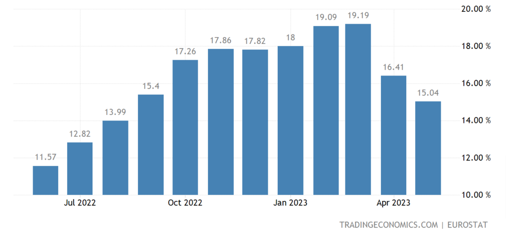 The cost of food in the European Union increased by 15.4% in May 2023 compared to the same month last year.