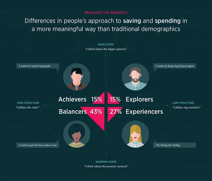 After all, “married two kids, employed, southwest United States” isn’t a “segment” to us. How can it be? All married or single people, employed or unemployed, southwestern or not, are different in the way they deal with money. Aren’t they? Surely people are more than demographics. People are how they behave. How they understand and react to the world around them. Money is such a big part of that reaction, that their mindsets in dealing with money ought to be powerful indicators for what kinds of features they value the most.